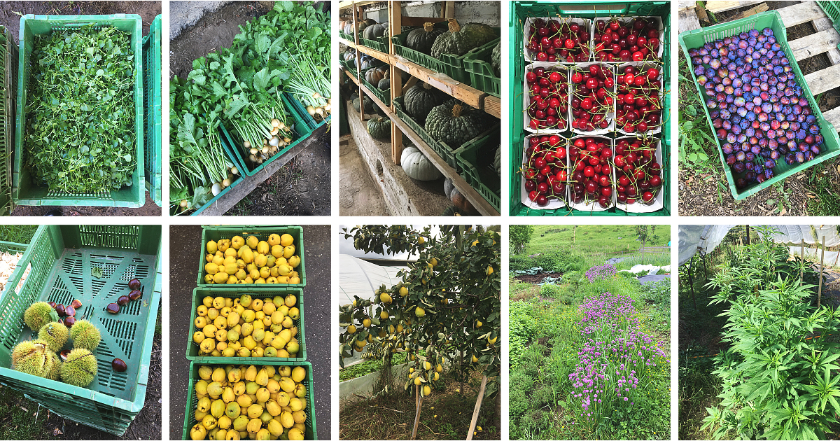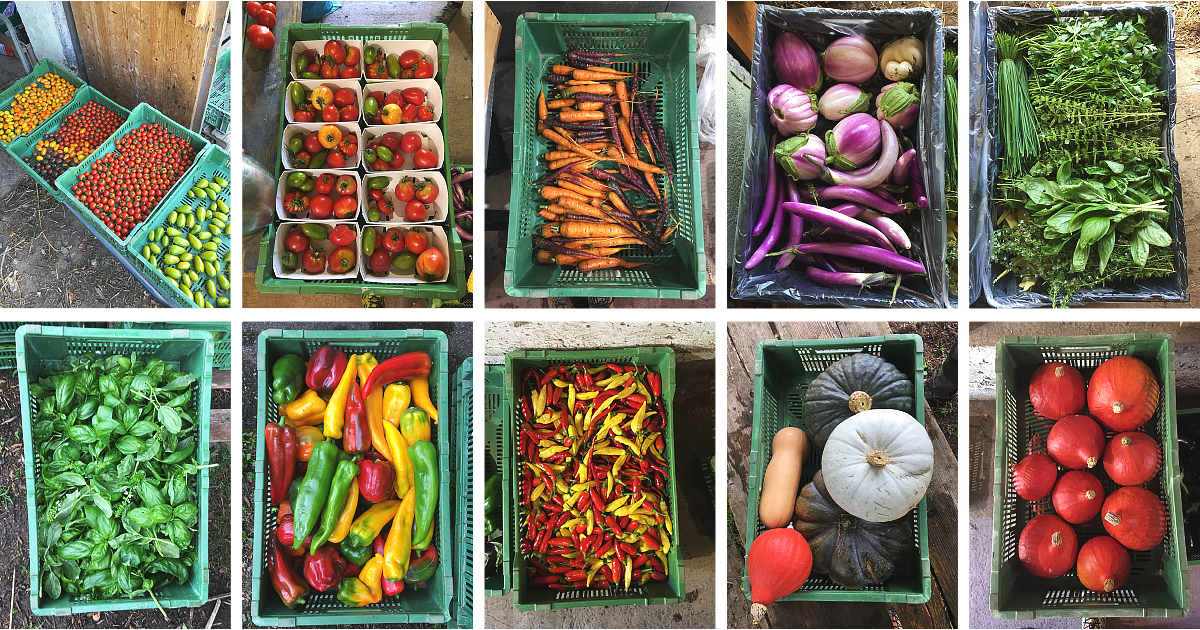 Nous cultivons plus de 80 variétés de légumes, des herbes aromatiques, des framboises, de la rhubarbe et du miel. Les variétés sont choisies avant tout pour leur origine, goût et beauté. Nous avons aussi 20 arbres fruitiers (pommier, poirier, prunier, mirabellier, cognassier, cerisier, noisetier, noyer, châtaignier, arbre à abeilles).